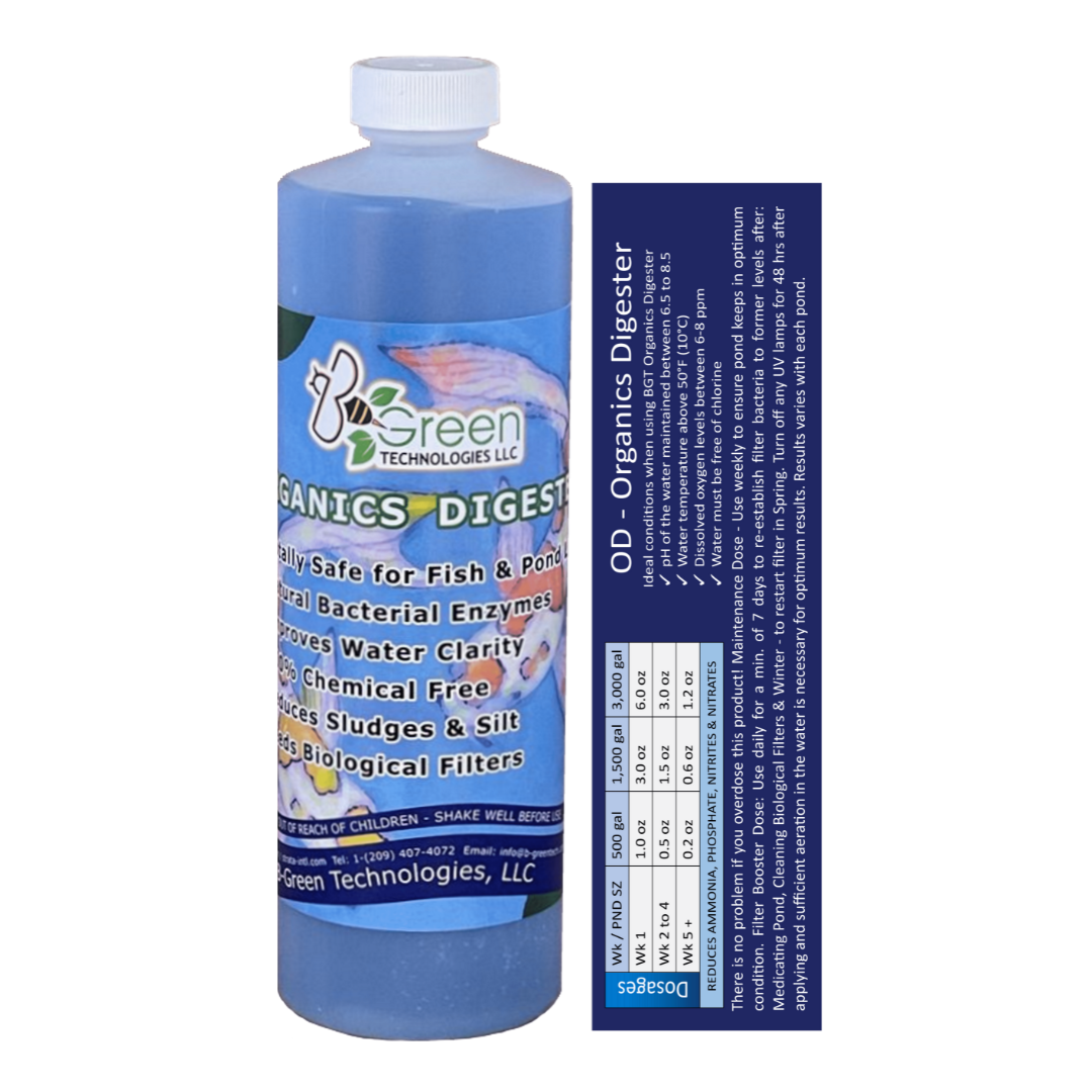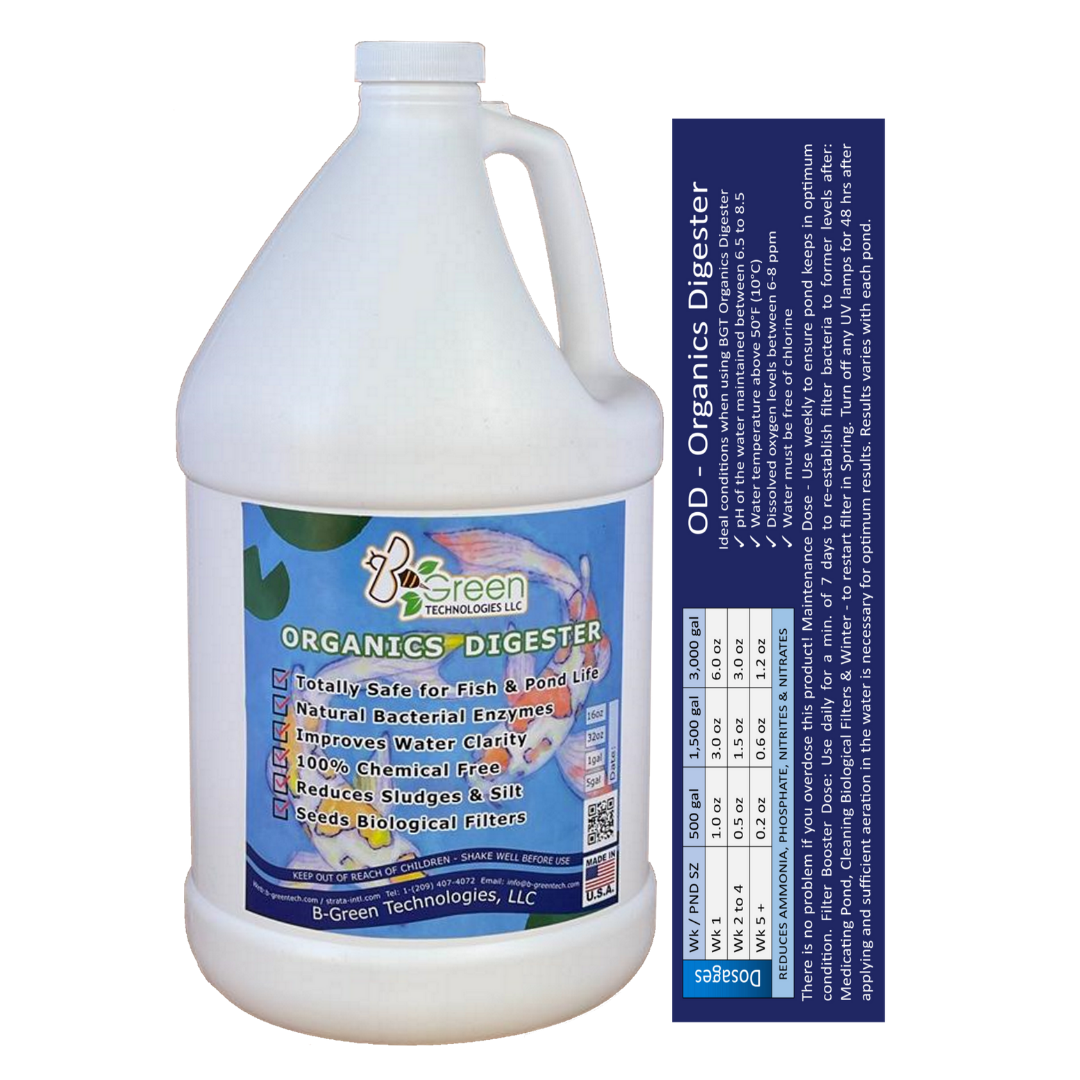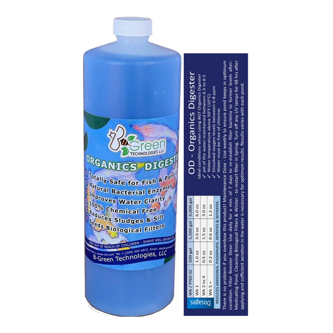 Answer: BGT Organics Digester is equipped with a full complement of photosynthetic, aerobic, facultatively anaerobic, anaerobic, and chemosynthetic organisms that address all the common problems encountered in pond maintenance including high ammonia and nitrite, undigested organics, algae blooms, organic sediment build-up, and foul odors. - Question: What can BGT Organics Digester do for my pond?
